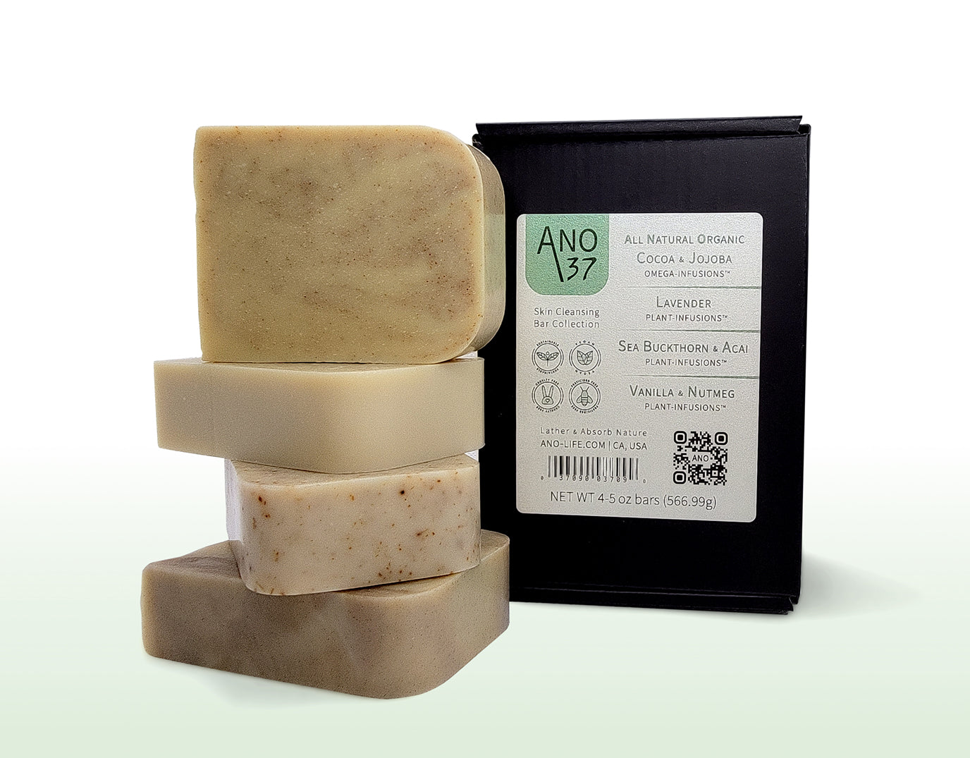 ANO37 Variety Pack (QTY 4) - a curated ensemble featuring all four ANO37 Omega/Plant-Infusions collection skin cleansing bars. Housed within a labeled box with UPC for easy tracking, each bar is thoughtfully enveloped in eco-friendly parchment (non-UPC labeled, not for individual sale). Elevate your inventory with this distinguished wholesale item that offers a premium showcase of our finest offerings.